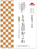 原材料名:無洗米[もち米(北海道産)]、とり五目おこわの具[鶏肉(国産)、人参、竹の子、こんにゃく、しょうゆ、ごぼう、きくらげ、油揚げ、砂糖、米発酵調味料、チキンエキス、食塩、たん白加水分解物、植物油、昆布エキス、鰹節エキス/調味料(アミノ酸等)、酸化防止剤(ビタミンC)、水酸化Ca(こんにゃく用凝固剤)、豆腐用凝固剤、(一部に小麦・大豆・鶏肉を含む)]